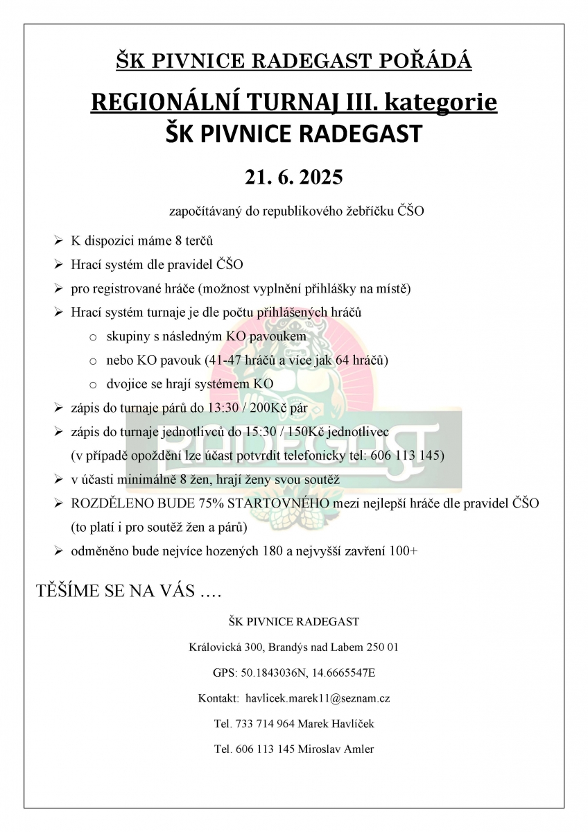 Přihlášením se na tento turnaj každý účastník bere na vědomí, že ČŠO zpracovává osobní údaje v platném formátu ČŠO a to v podobě přihlášky, startovní listiny, rozlosování turnaje a výsledků na webu ČŠO (https://www.czechdarts.org) a v informačním systém STEDAR (https://www.stedar.org). Více informací na https://www.czechdarts.org/rubrika/ochrana-osobnich-udaju