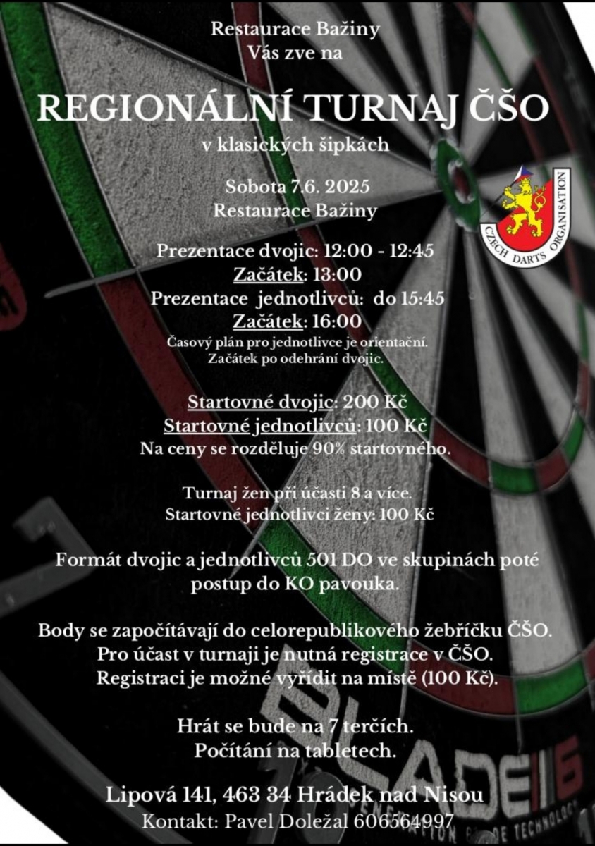 Přihlášením se na tento turnaj každý účastník bere na vědomí, že ČŠO zpracovává osobní údaje v platném formátu ČŠO a to v podobě přihlášky, startovní listiny, rozlosování turnaje a výsledků na webu ČŠO (https://www.czechdarts.org) a v informačním systém STEDAR (https://www.stedar.org). Více informací na https://www.czechdarts.org/rubrika/ochranaosobnich-udaju