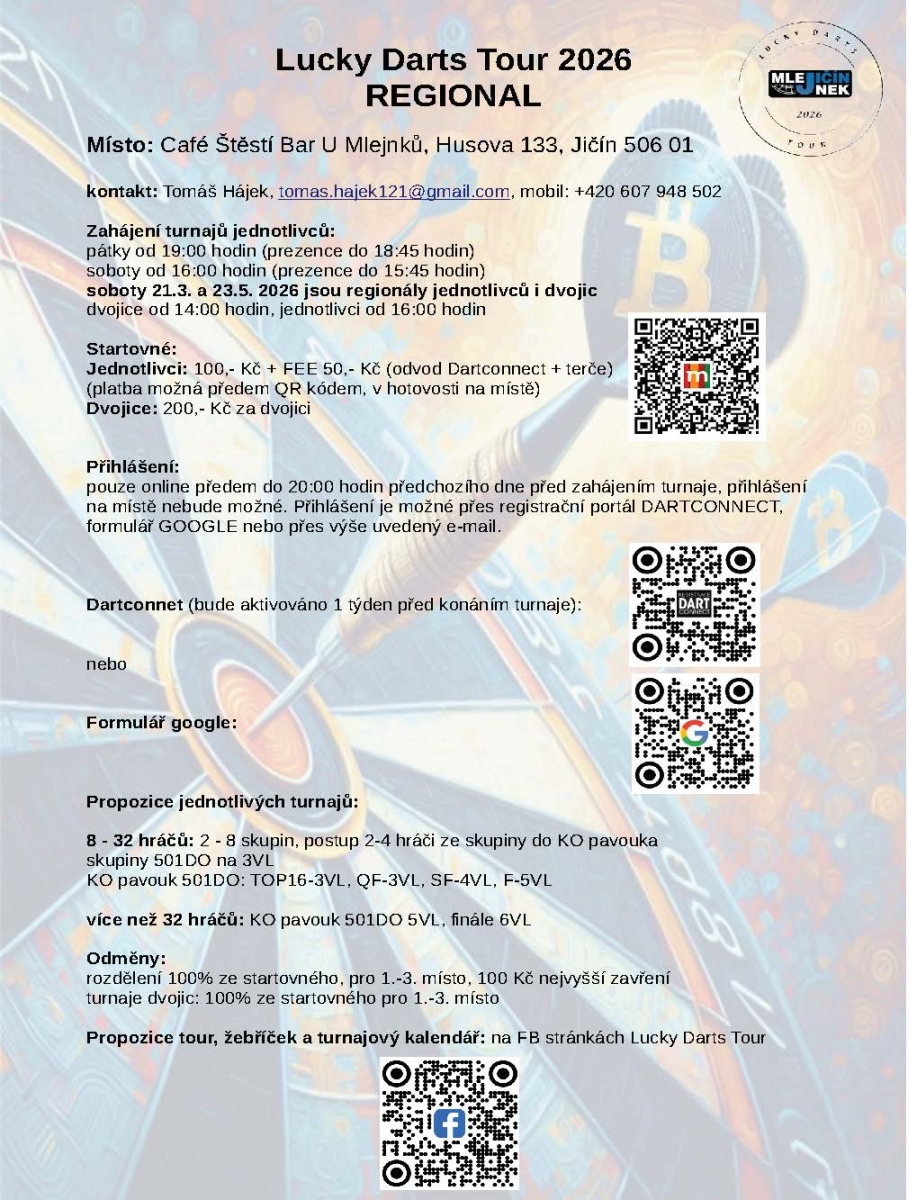 Přihlášením se na tento turnaj každý účastník bere na vědomí, že ČŠO zpracovává osobní údaje v platném formátu ČŠO a to v podobě přihlášky, startovní listiny, rozlosování turnaje a výsledků na webu ČŠO (https://www.czechdarts.org) a v informačním systém STEDAR (https://www.stedar.org). Více informací na https://www.czechdarts.org/rubrika/ochrana-osobnich-udaju