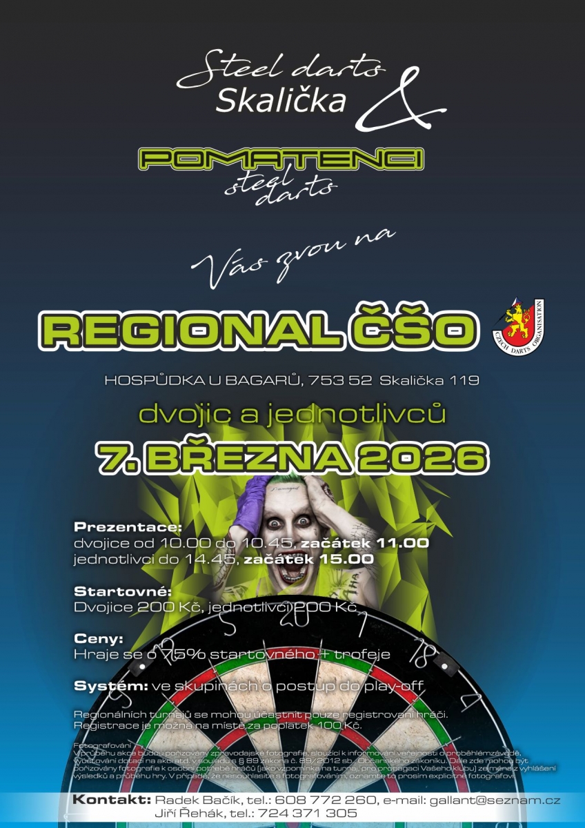 Přihlášením se na tento turnaj každý účastník bere na vědomí, že ČŠO zpracovává osobní údaje v platném formátu ČŠO a to v podobě přihlášky, startovní listiny, rozlosování turnaje a výsledků na webu ČŠO (https://www.czechdarts.org) a v informačním systém STEDAR (https://www.stedar.org). Více informací na https://www.czechdarts.org/rubrika/ochrana-osobnich-udaju