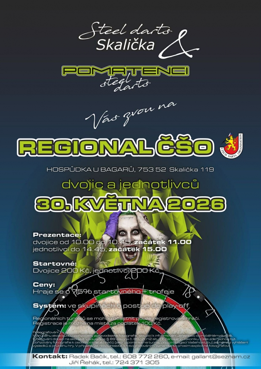 Přihlášením se na tento turnaj každý účastník bere na vědomí, že ČŠO zpracovává osobní údaje v platném formátu ČŠO a to v podobě přihlášky, startovní listiny, rozlosování turnaje a výsledků na webu ČŠO (https://www.czechdarts.org) a v informačním systém STEDAR (https://www.stedar.org). Více informací na https://www.czechdarts.org/rubrika/ochrana-osobnich-udaju