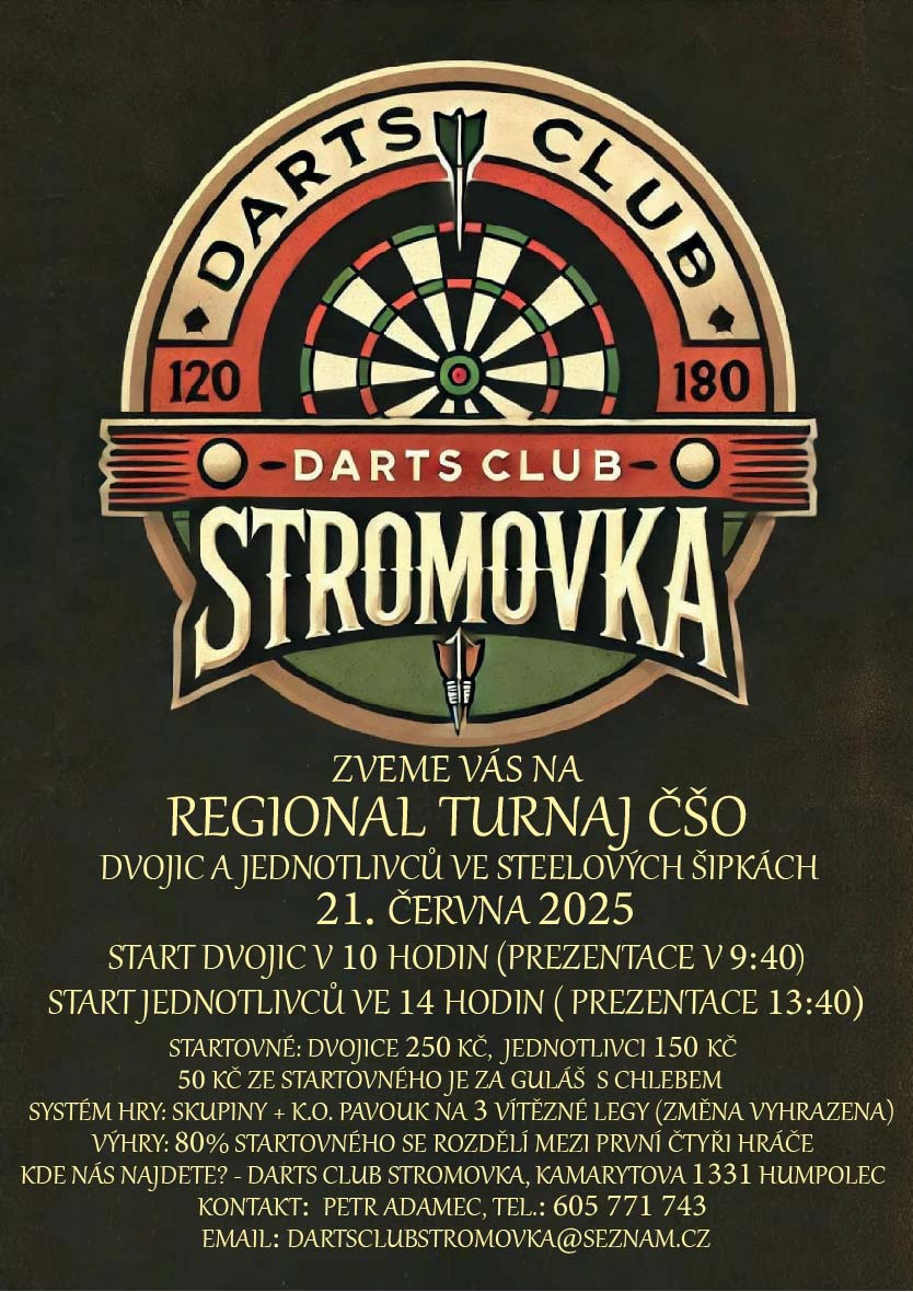 Přihlášením se na tento turnaj každý účastník bere na vědomí, že ČŠO zpracovává osobní údaje v platném formátu ČŠO a to v podobě přihlášky, startovní listiny, rozlosování turnaje a výsledků na webu ČŠO (https://www.czechdarts.org) a v informačním systém STEDAR (https://www.stedar.org). Více informací na https://www.czechdarts.org/rubrika/ochrana-osobnich-udaju