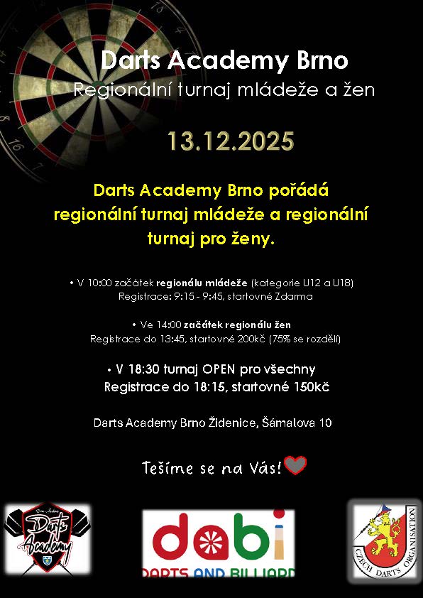Přihlášením se na tento turnaj každý účastník bere na vědomí, že ČŠO zpracovává osobní údaje v platném formátu ČŠO a to v podobě přihlášky, startovní listiny, rozlosování turnaje a výsledků na webu ČŠO (https://www.czechdarts.org) a v informačním systém STEDAR (https://www.stedar.org). Více informací na https://www.czechdarts.org/rubrika/ochrana-osobnich-udaju
